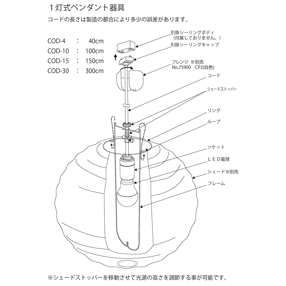 一灯式のコードで、すべてのAKARIペンダントタイプに取付けることができます。